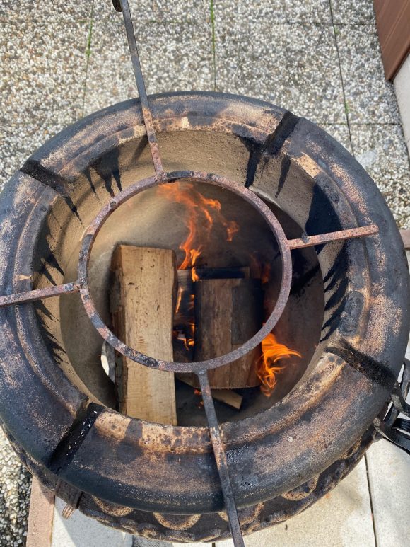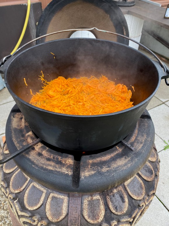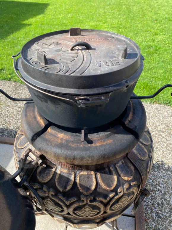 In unserem Fall heizen wir einen Tandir mit ein paar Scheiten Holz an und platzieren unseren Dutch Oven darauf. Der Topf hat ein Volumen von 12 Liter.