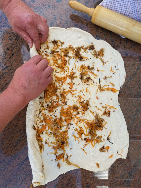 Während das Fleisch mit den Kartoffeln kocht werden die Strudel zubereitet. Dazu teilen wir den Teig in 3 gleich große Teile und rollen diesen mit etwas Öl auf eine Arbeitsplatte auf etwa 0,5 cm Dicke aus und verteilen ein drittel der Karotten-Zwiebel-Mischung darauf.