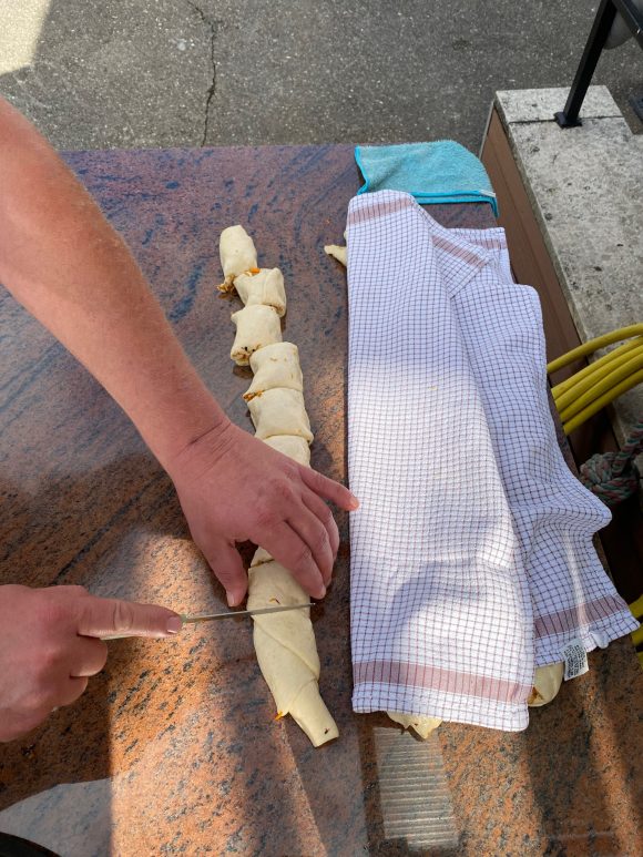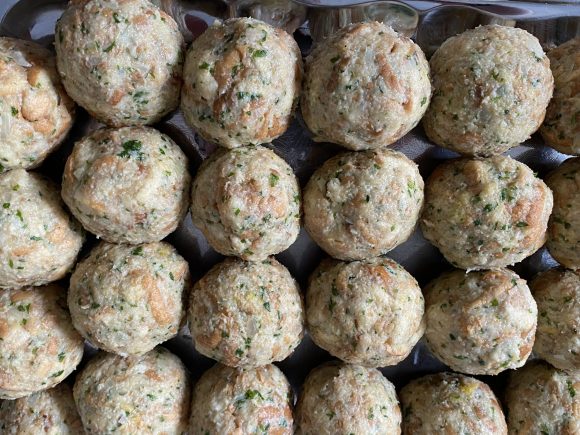Zu guter letzt werden die Knödel abgedreht. Wie man sehen kann ist die Struktur der Semmelscheiben gut erkennbar. Das sorgt dafür, dass die Knödel schön fluffig und nicht zu fest werden.