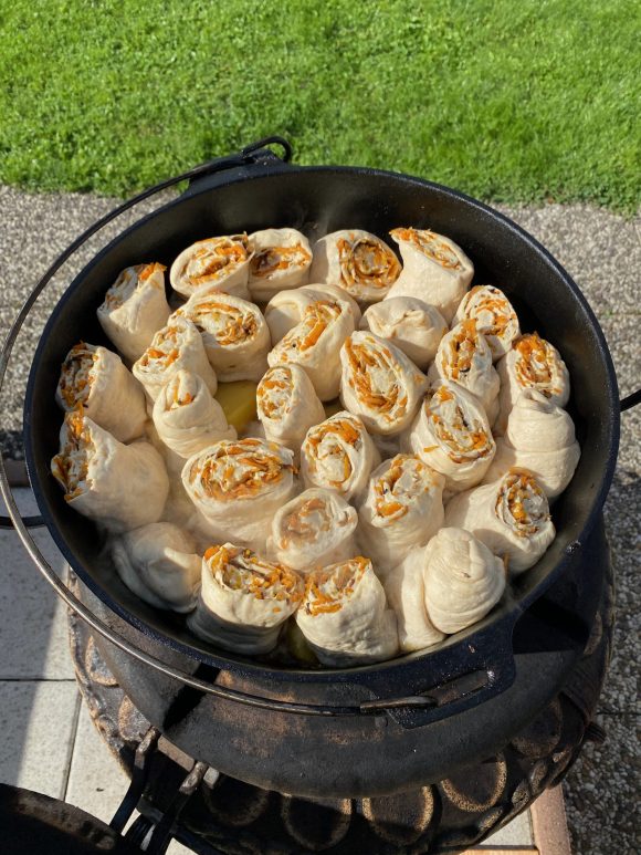 Aus obigen Zutaten einen glatten Hefeteig zubereiten und etwa 1 Stunde gehen lassen. Während der Teig geht, die Feuerstelle und den Dutch Oven vorbereiten. Man kann den Dutch Oven mit Kohlen oder mit Feuer beheizen. Da wir in dem Topf Fleisch und Gemüse richtig anbraten wollen, empfiehlt es sich mit Feuer zu arbeiten.