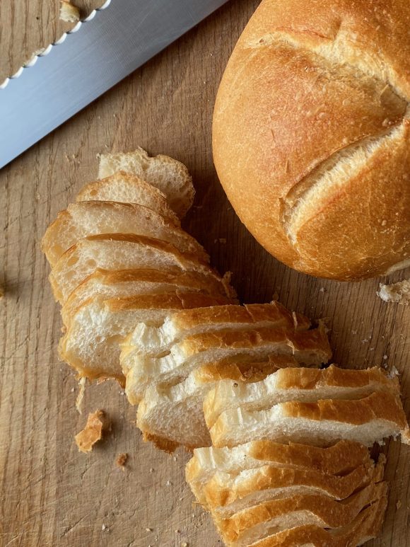 Die Semmeln/Brötchen in nicht zu dünne Scheiben schneiden. Ich empfehle kein Knödelbrot zu verwenden, sondern die Semmeln selbst zu schneiden – das macht die Konsistenz der Knödel am Ende aus.