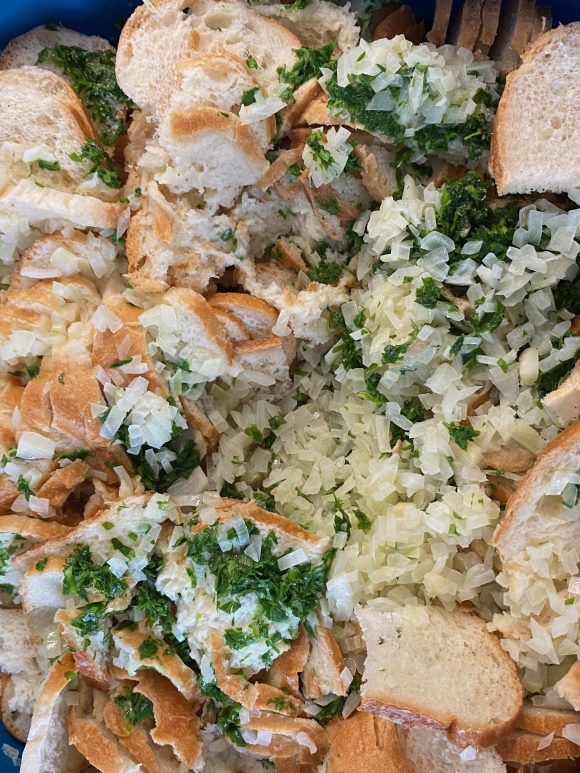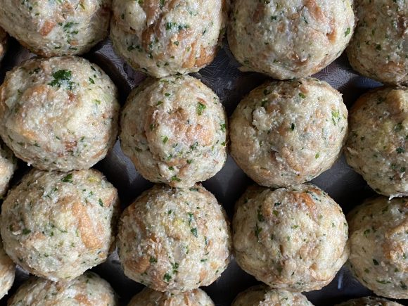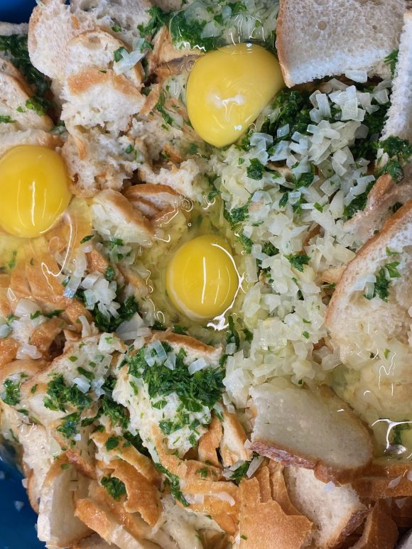Jetzt kommen die Petersilie und die Eier zu dazu und dann wird alles vorsichtig durchmengt. Die Zutaten sollen alle gut vermischt und es sollte ein kompakter Teig entstehen. Trotzdem muss die Struktur der Semmelscheiben noch erkennbar sein. Auf keinen Fall darf der Teig zu einer feinen Masse verknetet werden.