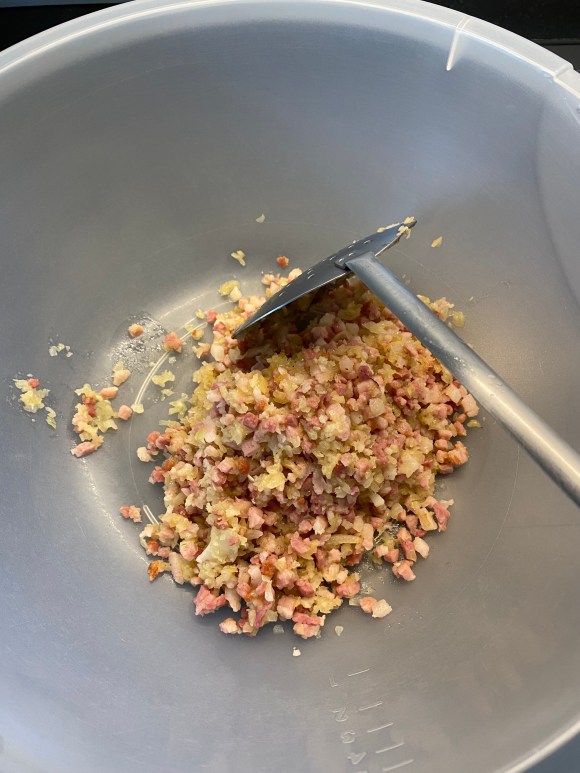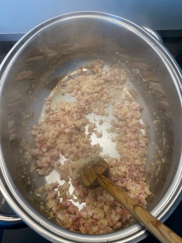 200g Speck und Zwiebel fein würfeln, den Knoblauch pressen und alles zusammen in einem großen Topf kurz anbraten, das Fleisch zugeben und zusammen weiter etwa 5 Minuten anbraten.