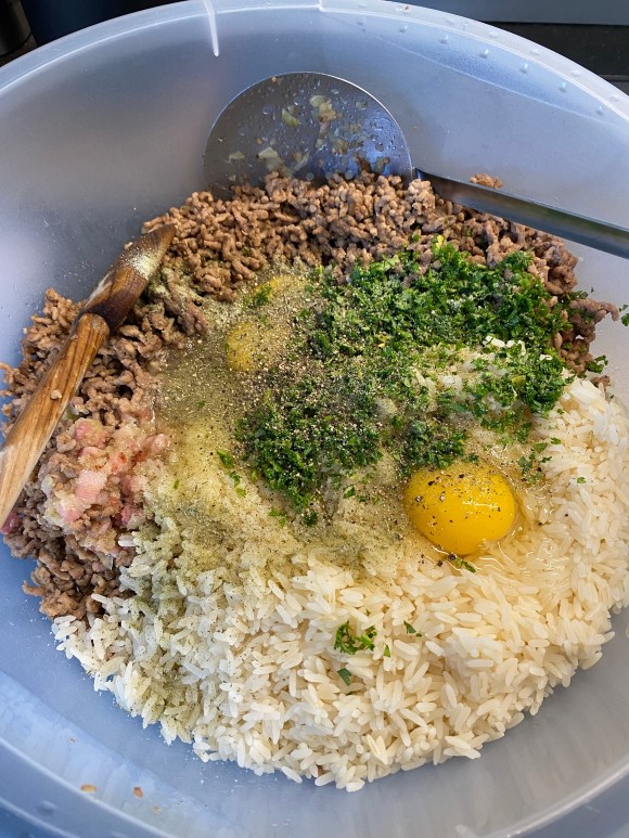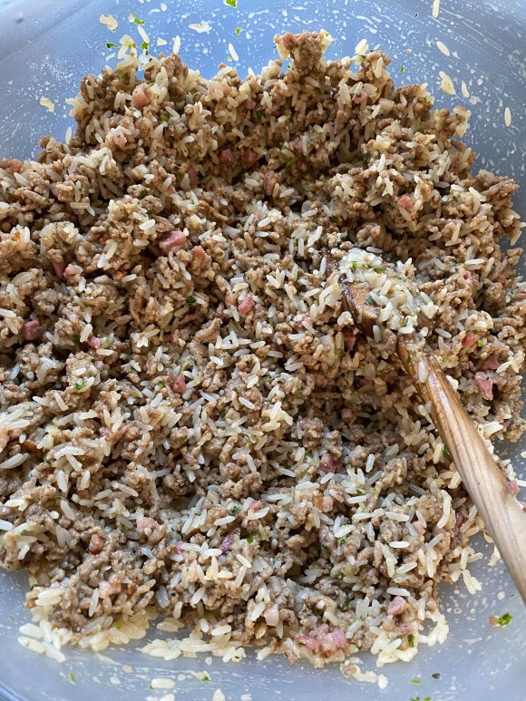 Fleisch, Speck und Zwiebel zusammen mit dem Reis in eine Schüssel geben und abkühlen lassen. Nun die Eier und die fein gehackte Petersilie zugeben und mit Salz, Pfeffer, Thymian, Oregano würzen. Alles gut vermengen und etwas Semmelbrösel zugeben, um die Masse abzubinden.