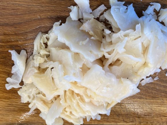 Nun pflücken wir vorsichtig die Blätter vom Sauerkrautkopf, um diese möglichst nicht zu beschädigen. Blätter die sich nicht mehr zum Füllen eignen (zerrissen oder zu klein) schneiden wir in Streifen.